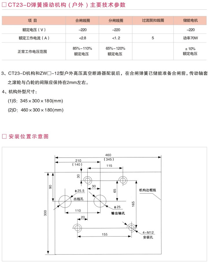 CT23型彈簧操動機構可供操作ZW□-12/630及以下戶外高壓真空斷路器及其合閘功與之相當 的其它高壓真空斷路器之用。CT23-S手動操動機構具有手動儲能合閘、手動分閘、過流保護等功能。 CT23-D電動操動機構具有電動和手動儲能、手動合分、過電流保護等功能,其機械壽命為10000次。 CT23-D電動操動機構系我公司設計的改進型電動機構,采用永磁直流電機、棘輪傳動儲能,動作 平穩、可靠性高,機械性能好,使用壽命長,手動儲能手柄設置在機構本體內,避免了原來該部件 的滲漏水環節,并且由于拉環設置在機構下部,使機構外型更為美觀,適宜于新、老戶外10KVS上真空斷路器之用。